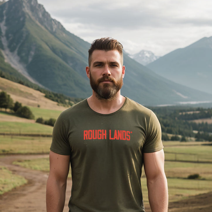 The Rough Lands olive tee with orange blaze logo for the outdoors. Soft and light weight for max movement.